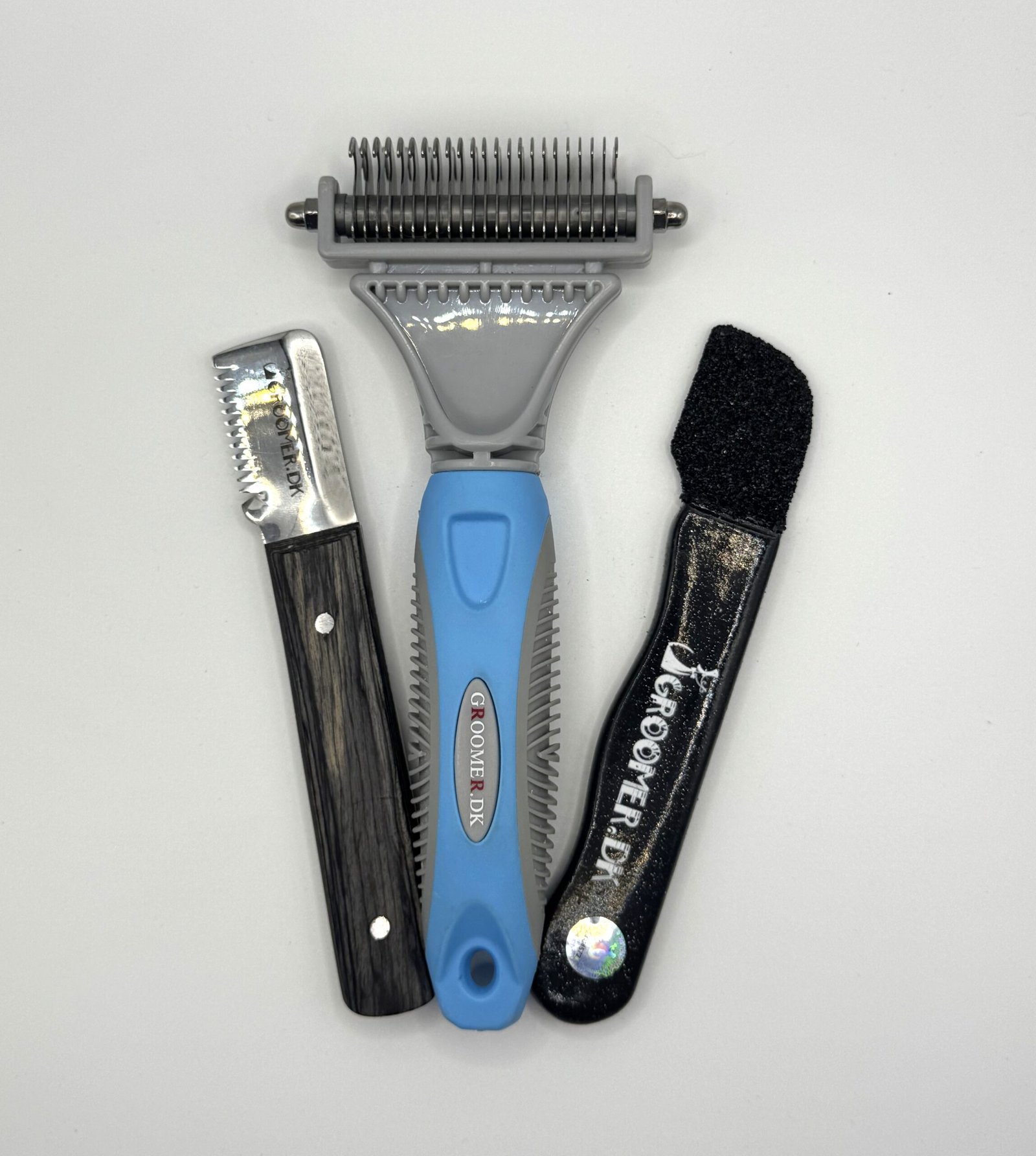 This bundle has been created to make life easier and work more efficient. Groomer.dk: hand dulled stripping knives and the TwinKing 2in1, too. All blunt! No risk of cutting coat and using those tools makes your life so much easier and your job considerably faster!