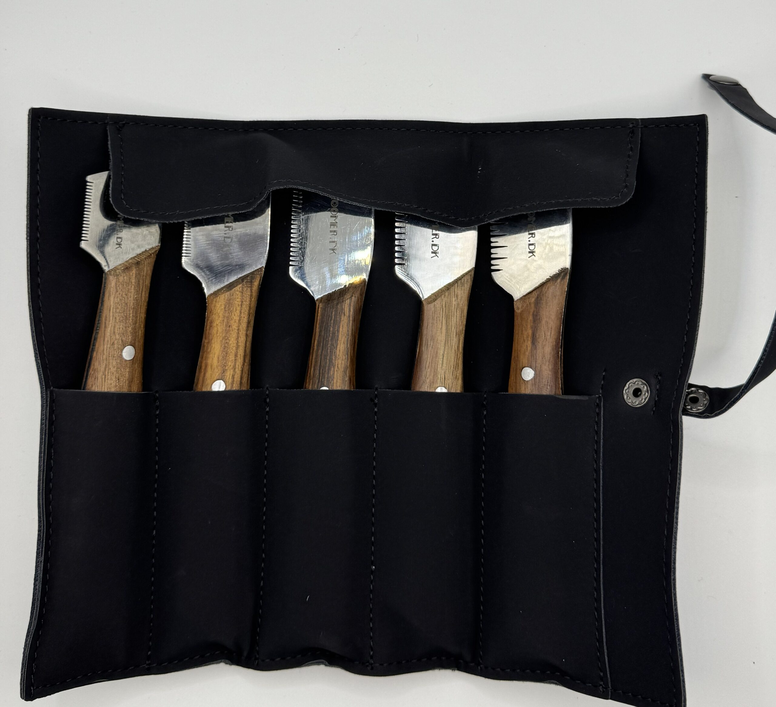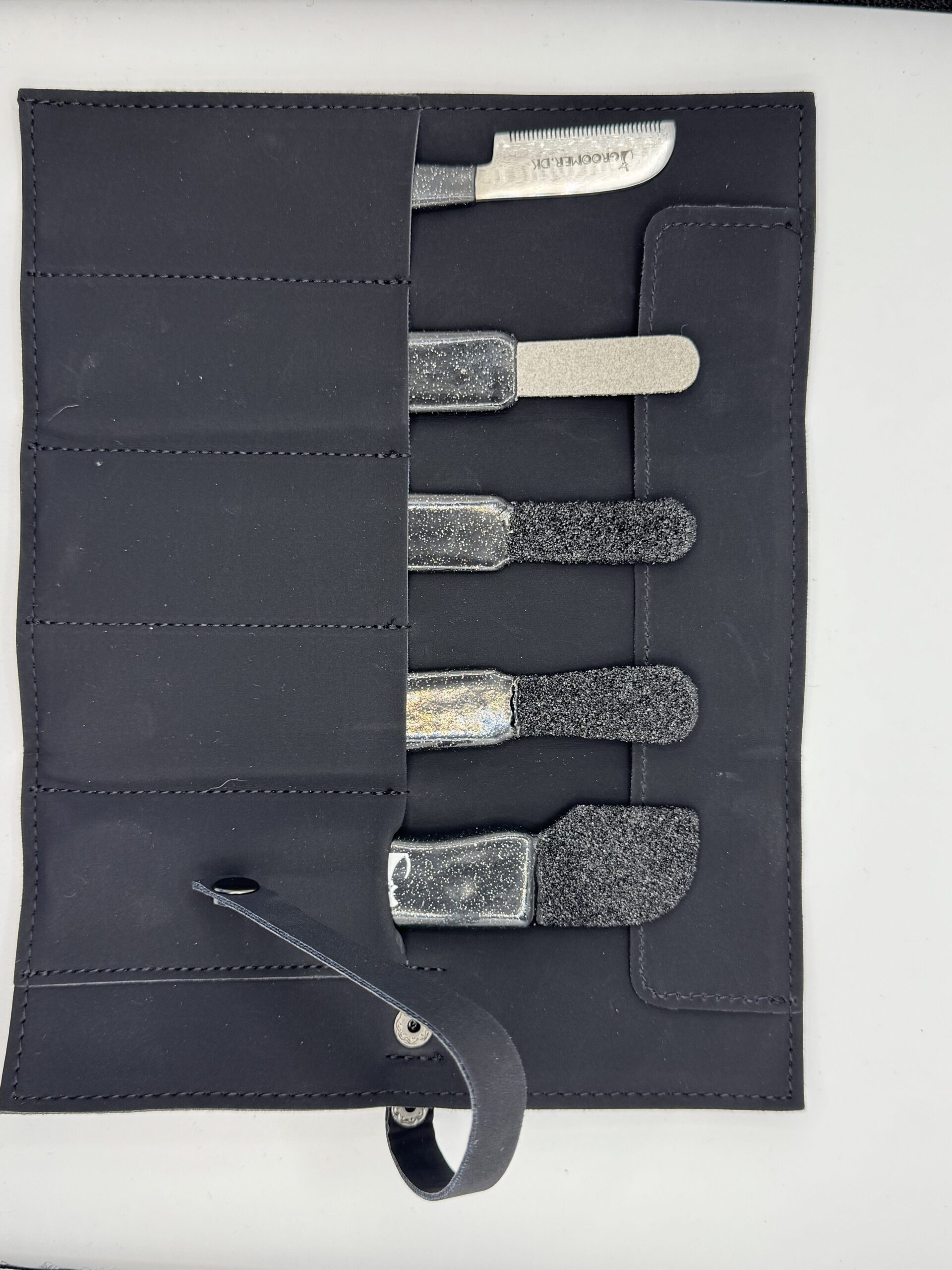 Keep your grooming tools safe, organized, and travel-ready with this sleek 5-Slot Tool Roll. Made from durable faux leather, this roll is designed for people who value both function and style. Perfectly sized for your stripping knives from Groomer.dk.